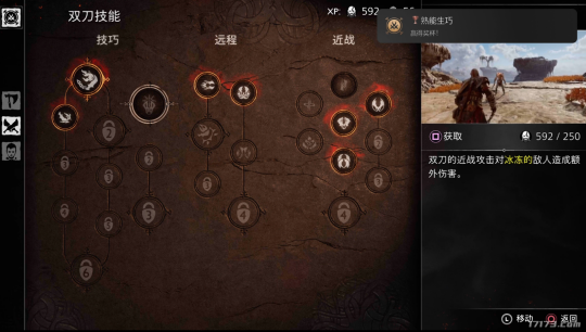 奎爷的老伙计链刃回归,和进入北欧后的默认武器战斧一起成为并行的两大主武器。混沌之刃主火,战斧主冰,两者的冰火属性不只体现在视觉上,在探索和解谜时也发挥着作用,可以用战斧冻住流水、用刀刃上的火焰烧掉障碍物等。在游戏后期增加的矛,则让奎爷耍出了杨家枪的味道,这是一个不可忽视的强力武器,在部分战斗环节有着不可替代的作用。
